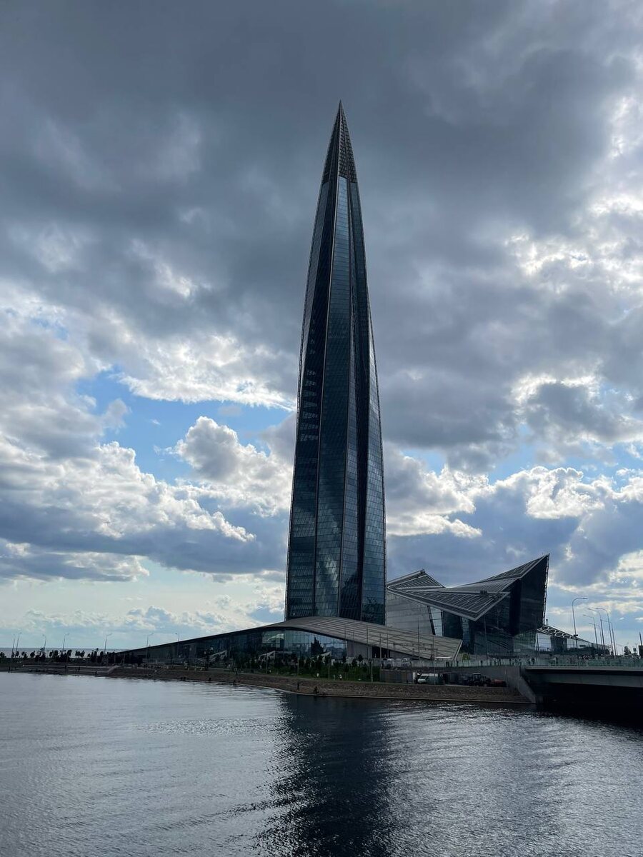 Арка главного входа доступна для посетителей. Только досмотр. Это фойе, через которое офисные сотрудники Газпрома идут на работу. На втором этаже этого космического пространства кафе. Пока единственное работающее в комплексе. К сожалению не сняла эти пироженки и их цены. Но кофе порядка 300 рублей. Пирожные от 500. Салатики в боксах в том же ценовом диапазоне. Мест за столиками не было. Особых видов из кафе тоже. Очередь человек 5-7.