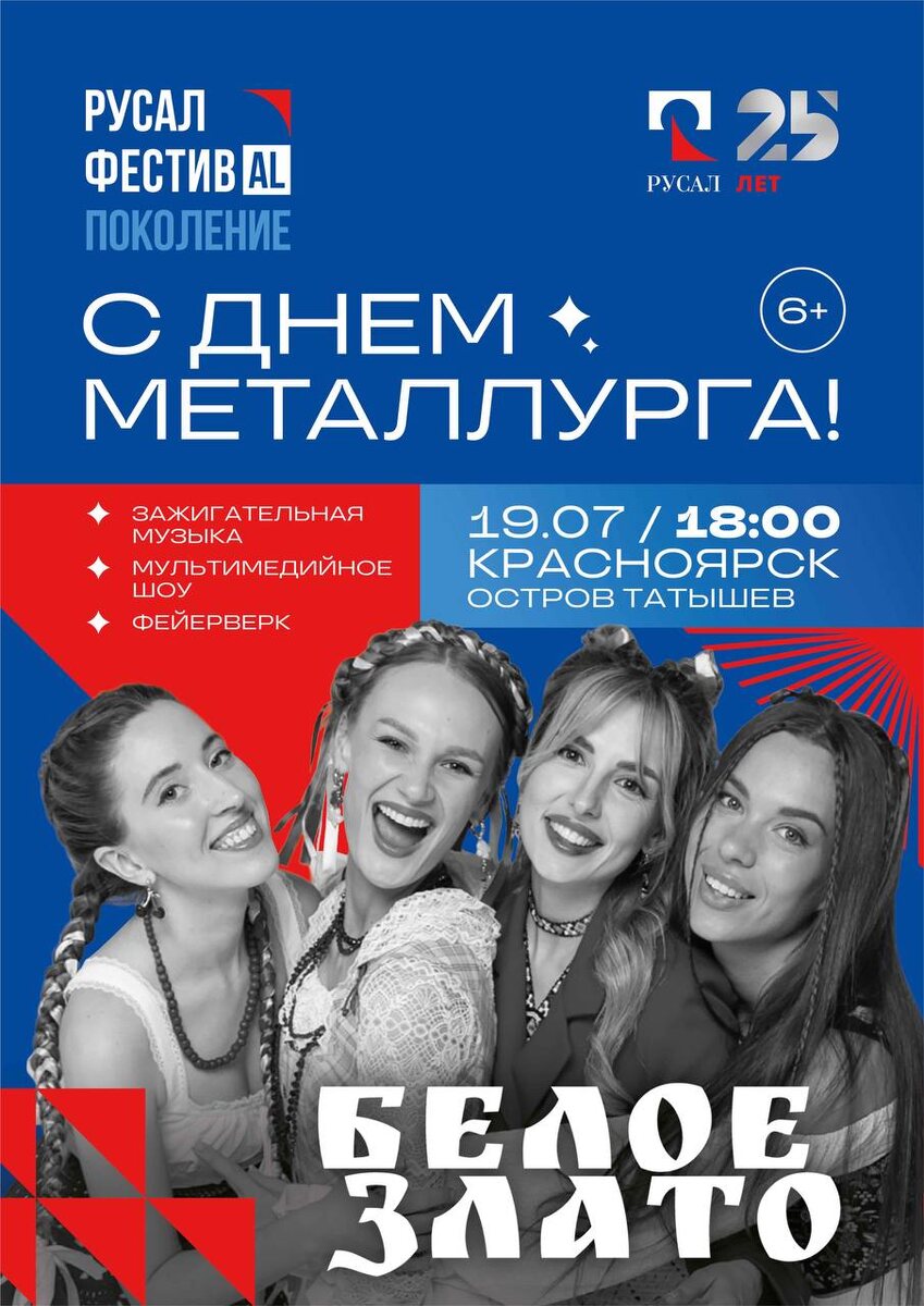 Уже завтра, 19 июля, БЕЛОЕ ЗЛАТО выступает на грандиозном фестивале РУСАЛ ФестивAL «Поколение» в честь Дня металлурга и 25-летия компании РУСАЛ!