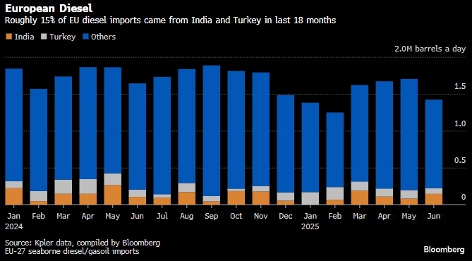 Мало кто верил, что ЕС примет запрет на дизель. Сама Россия почти не поставляет дизель в Европу, но ключевой объем дают страны, которые производят дизель, газойль и мазут из российской нефти. 18-й пакет санкций Европейского союза в отношении России еще больше усилил давление на и без того напряженный рынок дизельного топлива в регионе, который является крупнейшим импортером топлива. В пятницу ЕС подтвердил, что запретит импорт дизельного топлива, произведенного из российской нефти. До принятия этого решения некоторые трейдеры скептически относились к тому, что блок решится на такой шаг. Ещё до принятия решения на европейском рынке дизельного топлива наблюдались признаки напряженности. Независимые запасы, как и в США, низки, а спреды указывают на дефицит промышленного топлива. Блок получает около 15% поставок дизельного топлива морским путем (это около 240 тыс. б/д) из таких стран, как Индия и Турция, которые закупают сырую нефть у России. И это ставит под вопрос дальнейшую судьбу этих