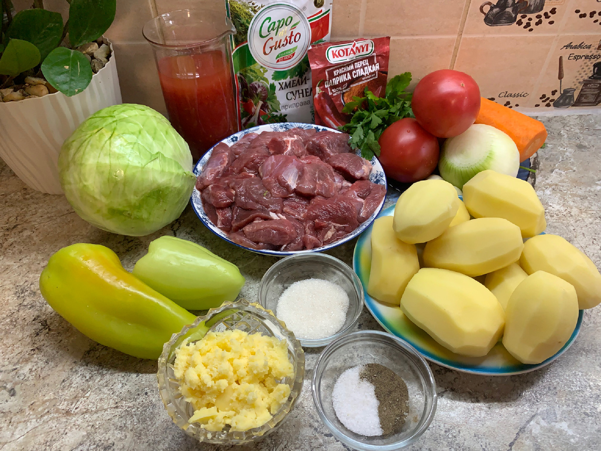 Простой и вкусный рецепт тушёного мяса – быстро, легко, пальчики оближешь! Хотите приготовить нежное, ароматное мясо с минимум усилий? Этот рецепт – идеальный вариант для сытного ужина без хлопот. Блюдо получается сочным, насыщенным и тает во рту, а готовится почти само! Ингредиенты: —————————————————— Крупно нарезаем овощи. Картофель, перец, лук, морковь, чеснок, помидоры 👇 На дно сотейника кладем немного топленного масла . Выкладываем мясо нарезанное крупными кусочками, и сверху мяса еще немного топленного масла👇 Следом лук нарезанный полукольцами 👇 Посолить, поперчить , добавить ст. ложку сахара без горки. Далее картофель👇 На картофель - перец👇 Посыпать паприкой, хмели-сунели, посолить , добавить чеснок. Далее морковь и помидоры . Посолить👇 Выкладываем веточками зелень 👇 Добавляем томатный сок, перемешанный с солью. Укрываем листьями капусты👇 Накрываем крышкой. Ставим на огонь. После того как закипит, тушим на медленном огне 2-2,5 часа. ——————————————————- Наше блюдо