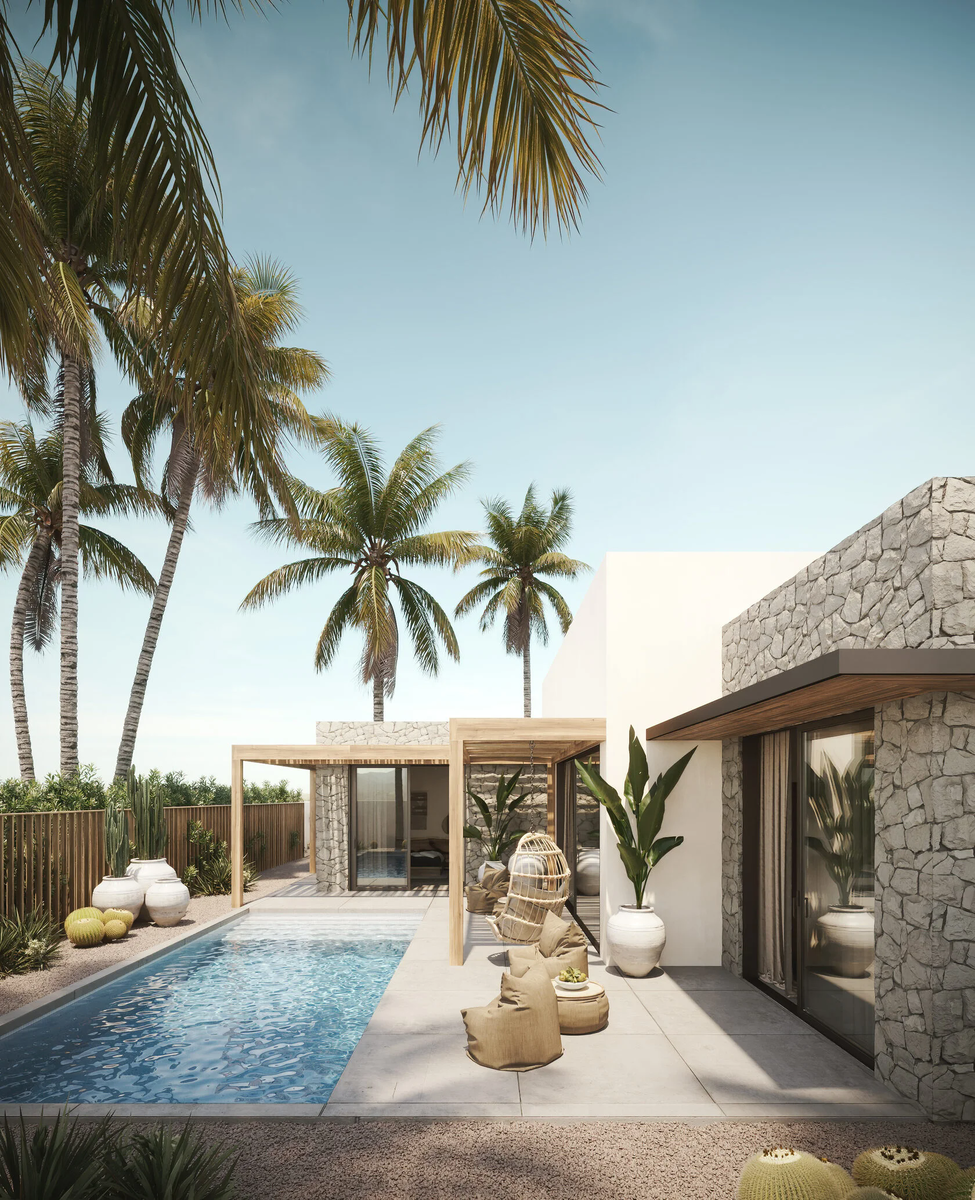 Floors: 1 The villa’s entry features handcrafted stone cladding, oversized clay pots, and lush tropical plants. The minimalist facade with warm wood and large windows sets a calming, upscale tone. Low-maintenance landscaping with cacti, gravel pathways, and native palms reduces water usage and enhances the villa’s eco-friendly appeal. Stone walls provide insulation and privacy, while organic textures reflect Dubai’s desert surroundings. A private pool sits at the heart of the villa, surrounded by shaded lounge areas and natural wood pergolas. Sliding glass doors create a seamless transition from interior to exterior — pe