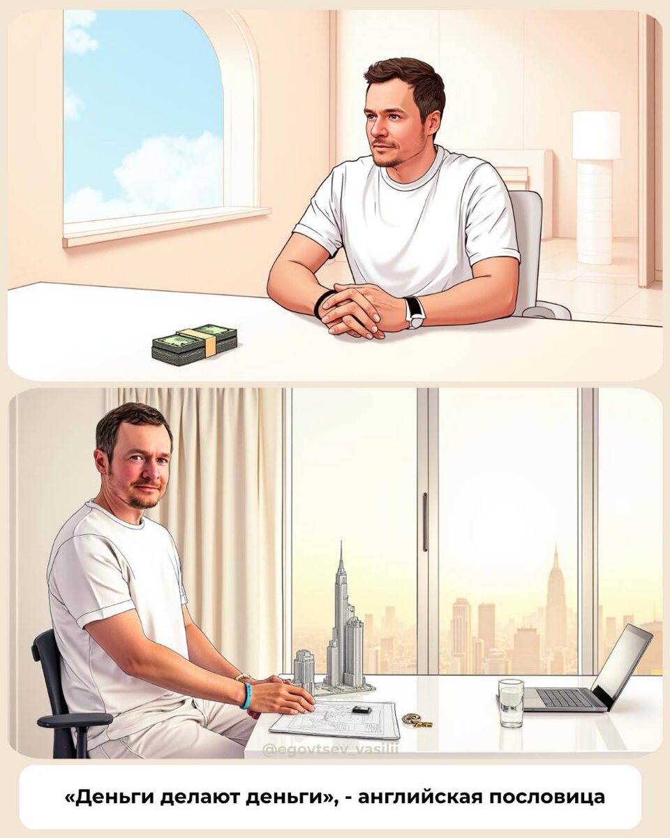 Деньги делают деньги. А голова — делает капитал. На первом фото — мужчина и деньги. На втором — мужчина и архитектура дохода. (Хотя всё начиналось с желания просто «зарабатывать больше».) Ты копишь. Потом вкладываешь. Потом понимаешь: капитал — это не сумма. Это система, которая приносит прибыль даже тогда, когда ты спишь, едешь на встречу или пьёшь чай с сыном. Между этими двумя фото — не годы. А решения. И понимание: не все деньги делают деньги. Только те, у которых есть цель.