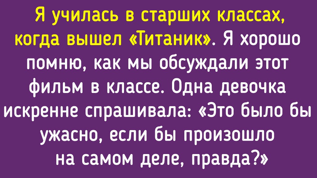 - Я училась в старших классах, когда вышел «Титаник». Я хорошо помню, как мы обсуждали этот фильм в классе. Одна девочка искренне спрашивала: «Это было бы ужасно, если бы произошло на самом деле, правда?»