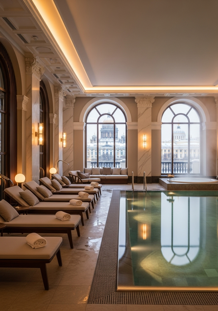 - В каких лучших спа-отелях Санкт-Петербурга есть бассейны? Все отели в рейтинге имеют бассейны, но самые впечатляющие — 20-метровый панорамный в Hilton Expoforum и термальные в Parklane Resort.