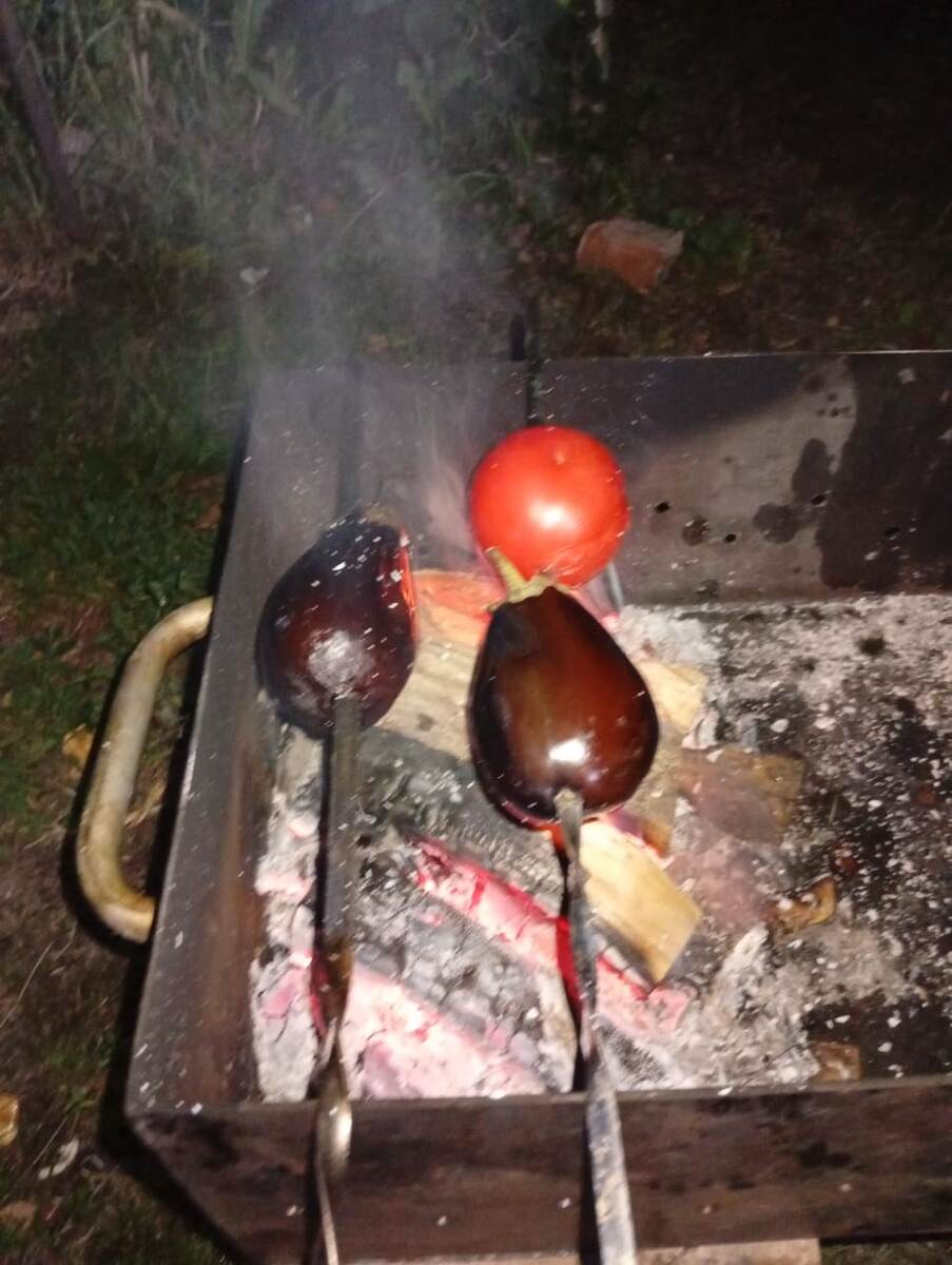 Пока шашлычный сезон в самом разгаре, спешу поделиться рецептом нереально вкусного теплого салата, который готовится невероятно просто, пока нажигаются угли для шашлыка и будет прекрасным гарниром к мясу. Но и сам по себе он очень вкусный. Нам понадобится: 2 средних баклажана, 1 крупный болгарский перец, 1 крупный спелый, а лучше 2 средних помидора ( от помидора очень зависит вкус, поэтому он должен быть спелым, сочным, сладким и ароматным) Зелень - у меня зелёный лук ( с белой частью), укроп и петрушка 4-5 зубчиков чеснока Соль Растительное масло Насаживаем овощи на шампура и запекаем/обжигаем над раскалёнными углями в мангале. Овощи должны именно подпечься - кожица станет чёрной, это нормально. По мере подпекания снимаем овощи с шампуров. Обычно это происходит в такой последовательности - первым запекается помидор, потом перец. Баклажаны пекутся дольше всего. Снимаем наши запечённые овощи и складываем их в миску, обязательно накрывая сверху крышкой. Можно сложить в пакет и пакет зав