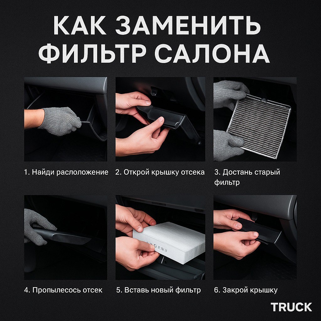 🧰 Замена салонного фильтра — проще, чем кажется Многие до сих пор катаются с забитым фильтром, потому что "некогда в сервис ехать". А зря. На большинстве машин поменять его — дело 10–15 минут, и даже инструмент не всегда нужен. 🔧 Пошагово: Найди расположение. Обычно — за бардачком или под капотом возле лобового стекла. Открой крышку отсека. Иногда нужно открутить пару саморезов или отжать защёлки. Аккуратно достань старый фильтр. Не тряси — в нём пыль, листва, грязь. Пропылесь отсек. Особенно если давно не менял — может быть мусор. Вставь новый фильтр по направлению потока. Стрелка airflow должна смотреть вниз или в сторону салона. Закрой крышку — и готово. 📍Совет: если в салоне душно, стёкла часто запотевают или пошёл запах — проверь фильтр. #ЗапчастиЯкутск #ЗапчастиДляГрузовиков #Truck #Truck14 #СалонныйФильтр #Обслуживание #Полезное 📲 Нужен фильтр под конкретную модель — пиши в Telegram-бот или WhatsApp +7 (924) 466-10-10 🌐 truck14.ru