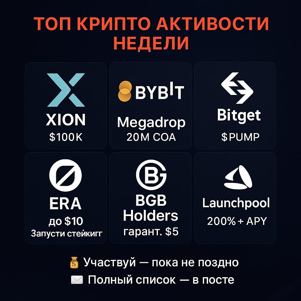 😮 Актуальные крипто-активности на неделю - участвуй и зарабатывай! Собрал для вас все важные ивенты: раздачи токенов, Launchpool, розыгрыши и кампании с наградами. Максимум профита - минимум усилий 👇 🏠 Bybit Megadrop: забери COA до листинга! Не пропусти новый Megadrop от Bybit с призовым пулом 20 000 000 COA. 💠 Что нужно: * Заблокируй USDT или MNT через Earn * Торгуй каждый день - увеличивай множитель * Получи до 1% от общего пула COA * Сроки: 18-21 июля * Снимки балансов - в случайное время * Листинг COA: 23 июля * Участвовать: ссылка * Регистрация: Bybit ——- 💼 Розыгрыш $ERA для комьюнити (2-й раунд) Розыгрыш $100 в ERA для Telegram-комьюнити Bitget! 🔹 Как участвовать: 1. Вступи в сообщество Bitget и новостной канал 2. Поучаствуй в ERA Launchpool 3. Поделись инфой в любом крипточате 4. Закинь скрины + UID под постом в чате Bitget с хештегом #BitgetERA * 10 победителей по $10 в ERA * Дедлайн: 21 июля * Подробности ——- 🪙 Гарантированные $5 в ERA - активность для BGB