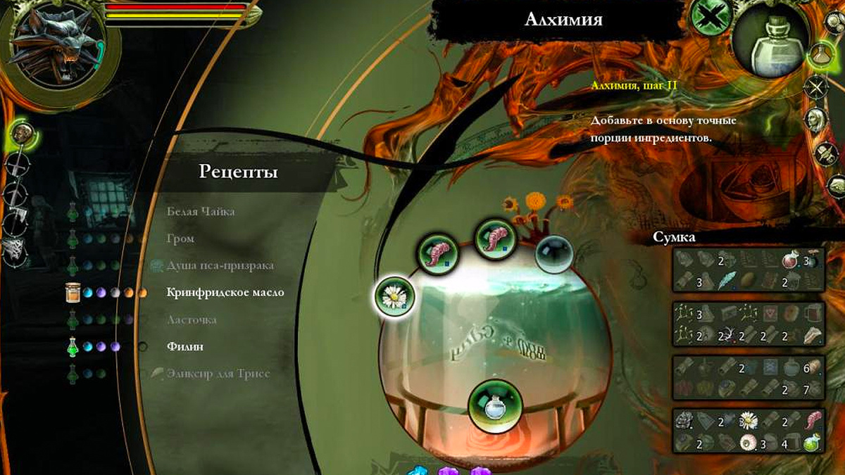 В первом Ведьмаке зелья изготавливались только во время медитации — никакого экспресс-крафта на ходу. Каждое зелье требовало точных ингредиентов, правильного алкоголя как основы и понимания рецептуры.