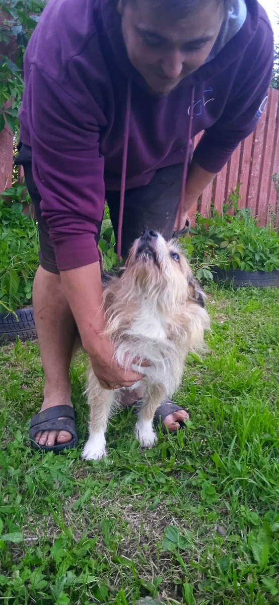 Позже мы узнали что Тотошку звали Боней - кличку помнит и сейчас откликается на обе клички. А еще он очень воспитанный песик - туалет строго на улице, причем делая дела по большому он прячется в высокую траву или в кусты и отчасти будущему хозяину не придется бегать гулять с пакетиками... Ведь сейчас запрещено удобрять органикой газоны и парки.