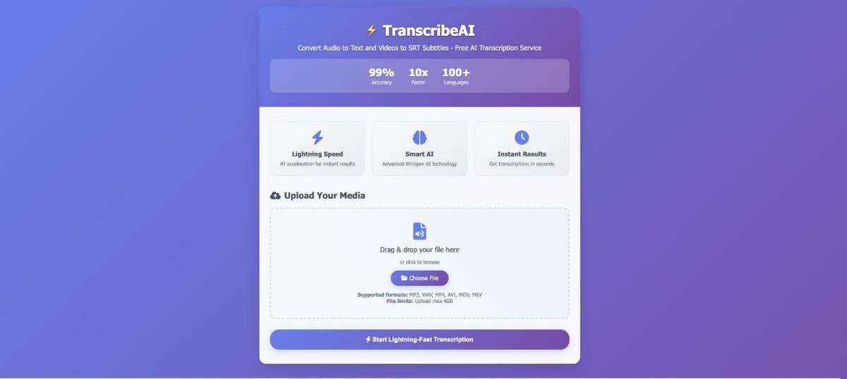 ТРАНСКРИБАЦИЯ БЕСПЛАТНО 🤖🔊 TranscribeAI берёт любой звук — от шума улицы до ваших сопелек в микрофон — и превращает это в читабельный текст. Кто-то там бубнит на фоне? Шум, помехи, визг микрофона? Да это всё не проблема. Whisper от OpenAI внутри — как супермозг, который слышит даже то, что вы сами не услышали. 🎧 Поддерживаются файлы до 4 ГБ — MP3, WAV, MP4, AVI, MOV, MKV и другие форматы, которые вы даже не знали, что поддерживаются. 🌍 Русский? Ага. И ещё 99 языков, включая эльфийский (шутка, но кто знает?). ⏱️ Таймкоды, субтитры в формате SRT, расшифровка лекций, подкастов, созвонов — всё это как по мановению волшебной палочки, только вместо палочки — кнопка "Upload". ПОЧЕМУ ЭТО КРУТО? 🍔💥 Потому что ты тратишь время не на расшифровку созвона, а на то, чтобы сделать из этого стратегию. Ты больше не копаешься в архивах подкастов, пытаясь вспомнить, где именно был тот момент. TranscribeAI — это как если бы твой голос стал текстом, а видео — субтитрами, и всё это — за секунды. Ты п