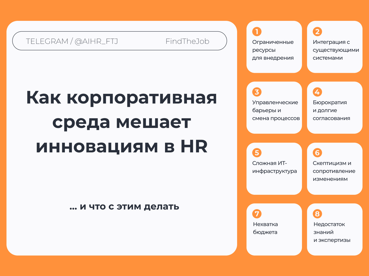 В больших корпорациях имеются ресурсы для экспериментов с HR технологиями, но корпоративная среда зачастую особенно инерционна. Можно выделить несколько основных препятствий для инноваций в рекрутинге у крупного бизнеса: