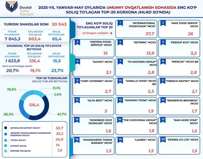 С января по май 2025 года 20 043 хозяйствующих субъектов, которые осуществляют свою деятельность в сфере общественного питания, уплатили в бюджет Узбекистана 663,4 миллиарда сумов налогов. Из них 126,4 миллиардов или 19,1% приходятся на 20 организацией. Отмечается, что их общий товарооборот составил 1,6 триллион сумов.