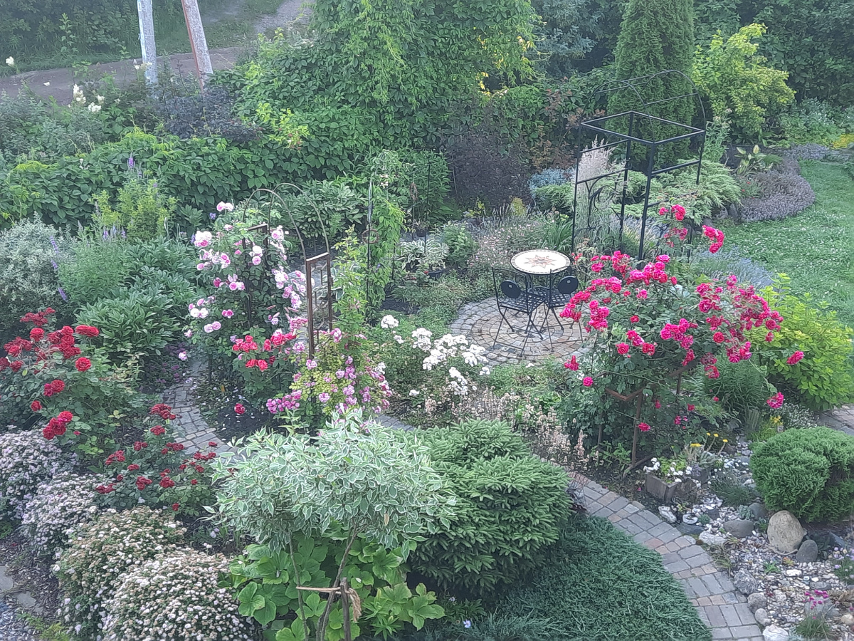 Вот они, вид с балкона. Утром. Вечером бывает красивее. Здесь почти все мои розы. Большие. Крошек не видно.