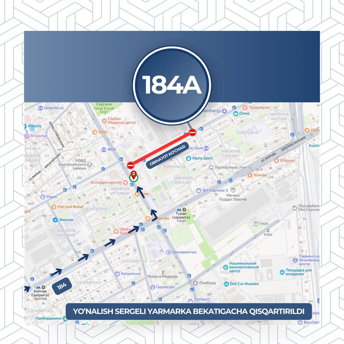Sergeli tumani Obihayot koʻchasida 19-iyuldan 18-avgustgacha avtomobil va yoʻlovchilar harakati toʻxtatiladi. Shu sabab 184, 40 va 143-sonli avtobuslar yoʻnalishi oʻzgaradi.