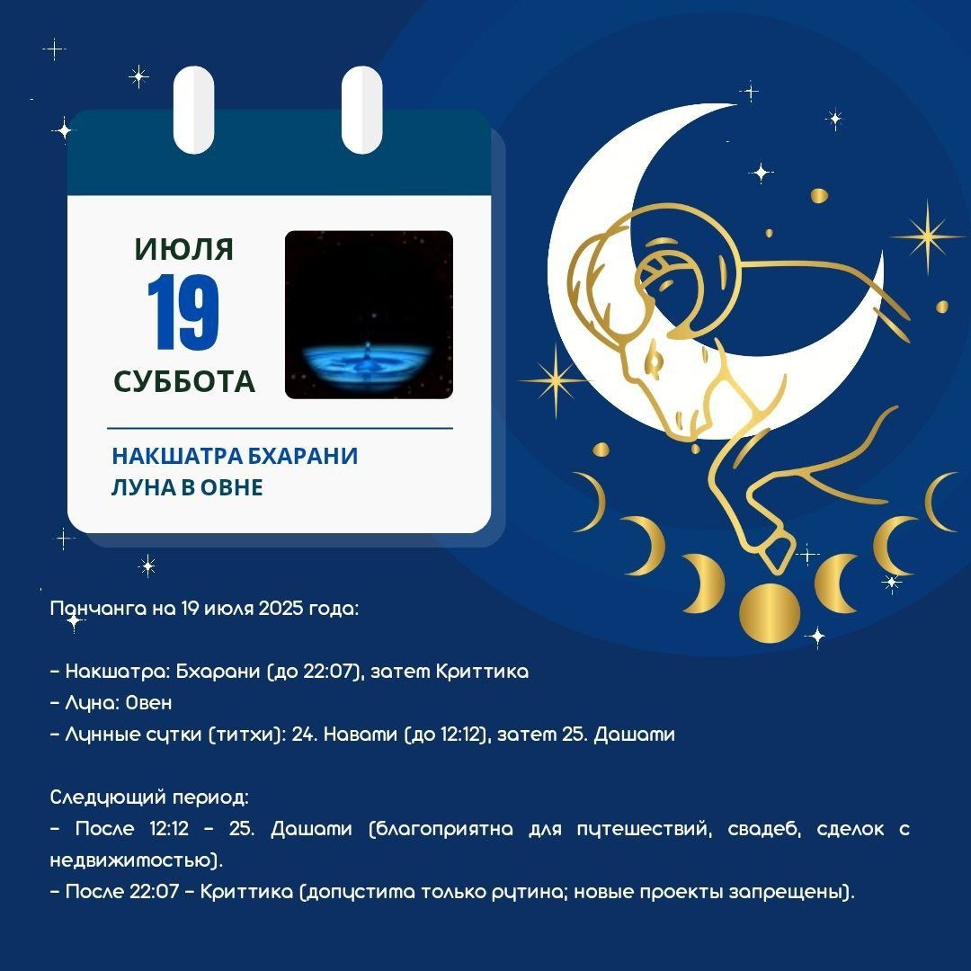 АСТРОДАЙДЖЕСТ НА 19 ИЮЛЯ | СУББОТА ♄ День Сатурна, Луна в Овне, сложный, но трансформационный 🙏КЛЮЧЕВЫЕ СОБЫТИЯ ДНЯ 🔠. До 12:12 — 9-е лунные сутки: Иллюзии, скрытые враги. Не начинайте новое. После 12:12 — 10-е сутки: Сила воли, прорыв. Лучшее время для действий! 🔠. Караны (половины титхи): До 12:21 Гариджа и затем, до 22:58 — Ваниджа. После 22:58 — Вишти. 🔠.Накшатра: Бхарани (Управитель — Венера) Характер: Сложная, но даёт невероятную выносливость. Задача: Принять ответственность, пройти через трудности ("нести ношу"). Риск: Гнев, поспешные поступки. Контролируйте эмоции! 🔠. Шула-йога (острые копья): Влияние: Конфликты, аварии, неожиданные проблемы. Совет: Не провоцируйте споры. Будьте осторожны с острыми предметами, техникой. 🌀 БЛАГОПРИЯТНЫЕ ПЕРИОДЫ: Абхиджит: 12:02–13:09 Начинать проекты, молиться, принимать судьбоносные решения. Виджая с 15:23–16:30 Хорошо для начала путешествий. НЕБЛАГОПРИЯТНЫЕ ПЕРИОДЫ Раху Калам: 08:24–10:30 ⭐️РЕКОМЕНДАЦИИ НА ДЕНЬ - До 12:12: Заверша