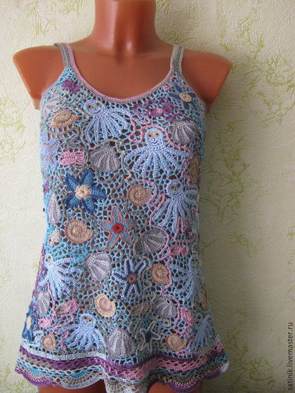 Набрела я случайно на схемы вязания морских жителей, а там понеслось! Столько невероятной красоты навязали уже мастерицы, и всё такое красивое... К сожалению, не нашла автора этого топика, но я так надолго зависла, любуясь на него, что показываю первым. Очень гармоничное сочетание пастельных цветов, расположение элементов... Даже кайма внизу отлично сочетается с основным полотном. Любуйтесь! Ещё одно морское чудо: Работа Елены Белых. Когда-то я пробовала связать топик в технике ирландского кружева (получилось грубо и аляписто😀🤦♀️), и поняла самые главные трудности и особенности этого вида вязания: Но для нас есть хорошие новости: можно упростить работу и в некоторых случаях обойтись без сетки. Вот с этой работой могут справиться многие крючкотворцы: Здесь на сумку нашиты ракушки, водоросли, морские звезды, которые сами по себе вяжутся легко. Точно также можно нашить вязаные элементы на готовый топик, тунику, юбку. Конечно, изделие получится не таким изящным, как на первых фото,