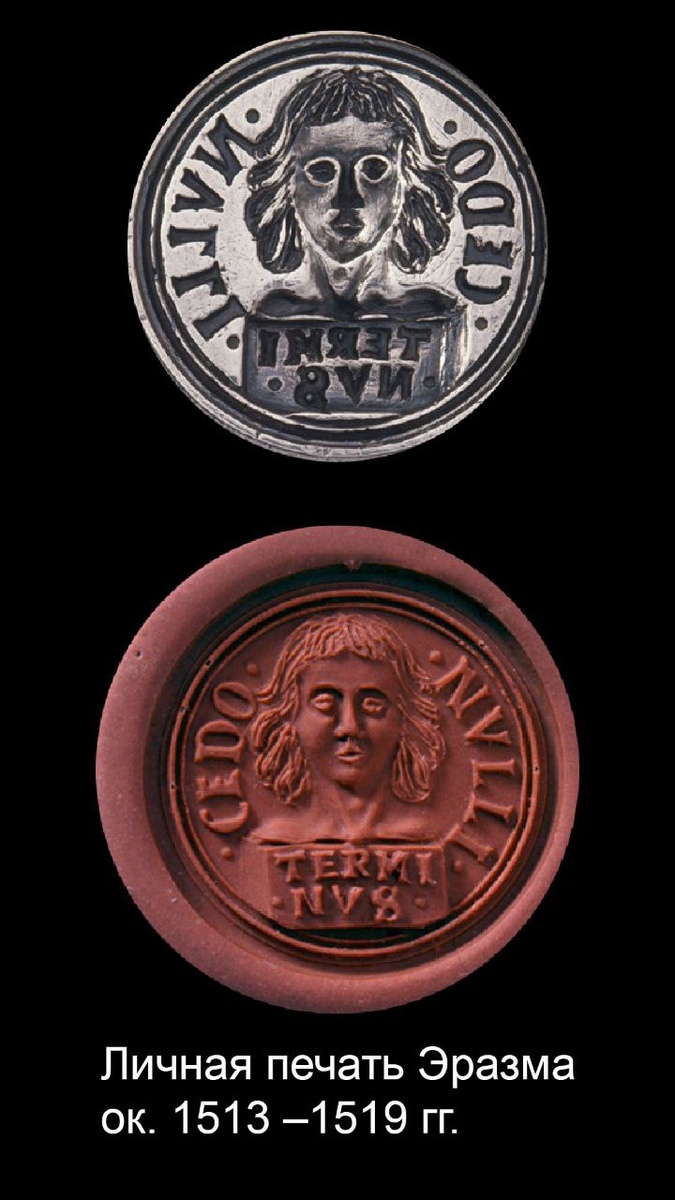 Знали ли вы, что личной эмблемой Эразма Роттердамского был Терминус и что идеей этой эмблемы мыслитель обязан тем самым Стюартам? Бог границ стал символом ученого после того, как сын короля Шотландии Якова VI Александр Стюарт (1493–1513) подарил Эразму античную гемму в благодарность за обучение. На гемме был изображен Дионис, но Эразм решил, что это – Термин, и сделал его своей эмблемой в сочетании с девизом “Не уступаю никому” (“concede nulli”). Термин, покровитель пограничных камней и стелл, был известен не только своим героическим противостоянием Юпитеру, но и тем, что его культ, включавший жертвоприношения, был связан с идеей нерушимости границ Рима. Так что выбор Эразма можно считать пророческим, поскольку границы могущества Рима и жертвы, к сожалению, человеческие, связанные с установлением этих границ, стали лейтмотивом последних лет жизни мыслителя. Интересна эволюция иконографии эмблемы Эразма. На личной печати 1513 года использовано изображение с античной геммы, но уже на м