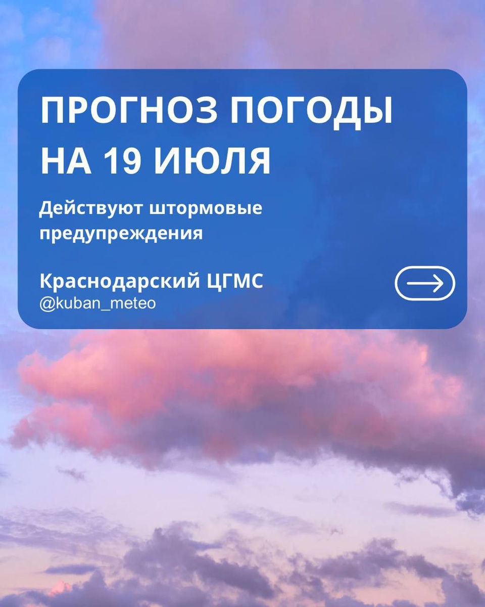☁️⛅⛈️ 🌩 На Кубани сохраняется контрастная и неустойчивая погода. Продолжает действовать штормовое предупреждение. В отдельных районах — ливни, грозы, град и шквалистое усиление ветра. На востоке и севере края сохраняется жара до опасных отметок. 📍 По Краснодарскому краю 19 июля Переменная облачность. Утром, днём и вечером местами кратковременный дождь и гроза. В отдельных районах — сильный дождь, ливень в сочетании с грозой, градом и порывами ветра 20–25 м/с (КМЯ). 💨 Ветер западной четверти 4–9 м/с, местами порывы 12–14 м/с. 🌡 Температура воздуха: • ночью +20…+25°, в юго-восточных предгорьях +16…+21°, • днём +31…+36°, в северной и восточной половинах края — сильная жара +39° (ОЯ), • в горах ночью +12…+17°, днём +18…+23°, • на Черноморском побережье ночью +20…+25°, днём +29…+34°. 🏙 По г. Краснодару Переменная облачность. Ночью — без осадков, днём — кратковременный дождь и гроза. 💨 Ветер западной четверти 4–9 м/с, при грозе порывы 12–14 м/с. 🌡 Температура воздуха ночью +21…+23