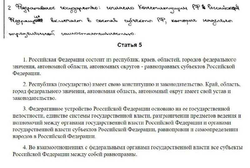⚡️Сложные «местечки» второй части ⚡️ Указание в 23 задании не статьи Конституции РФ, а определения термина В 23 задании спрашивают доказательство того, что РФ федеративное государство, социальное государство, государство с республиканской формой правления и т.д. 😥типичная ошибка - выполнение задания без опоры на статью и приведение определения. Например, нам нужно доказать,что РФ - федеративное государство ❌Неправильно: РФ федеративное государство, так как состоит из субъектов, обладающих определенной политической самостоятельность (это определение термина, но не положении из закона) ✅Правильно: Конституция РФ закрепляет,что РФ состоит из республик, краев,областей, городов федерального значения, автономной области и автономных округов - равноправных субъектов РФ (это положение из Конституции) Ученику,который написал такой ответ (см фото) не засчитали суждение, так как он попался в эту "ловушку"