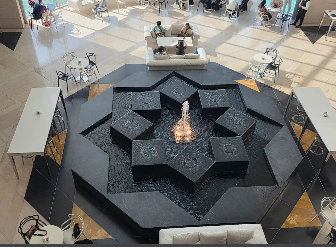 Величественный атриум музея поражает воображение своей грандиозной композицией. В его центре, словно паря в воздухе, висит монументальный светильник — сияющее кольцо, покрытое изящной арабской вязью. Его тёплый свет мягко рассеивается в пространстве, создавая атмосферу таинственности. Этот архитектурный шедевр эффектно контрастирует с полом первого этажа, где выложена великолепная мраморная розетка.