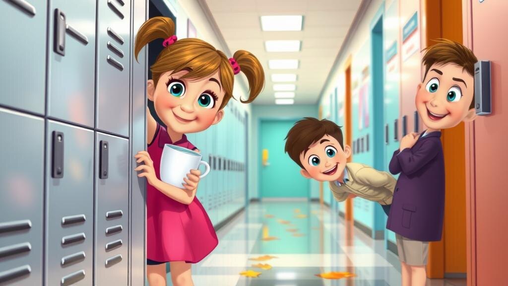 Маша и скрипучий шкафчик В начальной школе за спортзалом есть особенное место — маленький тёмный коридор, где стоят старые шкафчики и пахнет пыльными учебниками. Маша никогда туда не заходила одна: пространство кажется загадочным, а под ногами всегда хрустит песок то ли от ботинок, то ли просто от времени. В этот день перемена выдалась длинной. Подруги выбежали на улицу, а Машу что-то как будто потянуло к самому дальнему шкафу. Она осторожно коснулась холодной ручки — та скрипнула, показалось, что за дверцей кто-то прячется. — Ты куда? — послышалcя позади голос. Это был Тимур, он обычно смеётся громче всех. — Посмотри, тут внутри что-то странное воняет, — выдумала Маша, чтобы не показывать, что на самом деле ей просто любопытно. Тимур подошёл вплотную, подслеповато уставившись в тёмную щель: — Может, это чей-то суп забыли? Они оба засмеялись, и Маша смелее открыла дверцу настежь. Внутри лежала кучка желтых осенних листьев, на которых аккуратно стояла… белая чашка! Рядом валялся кл