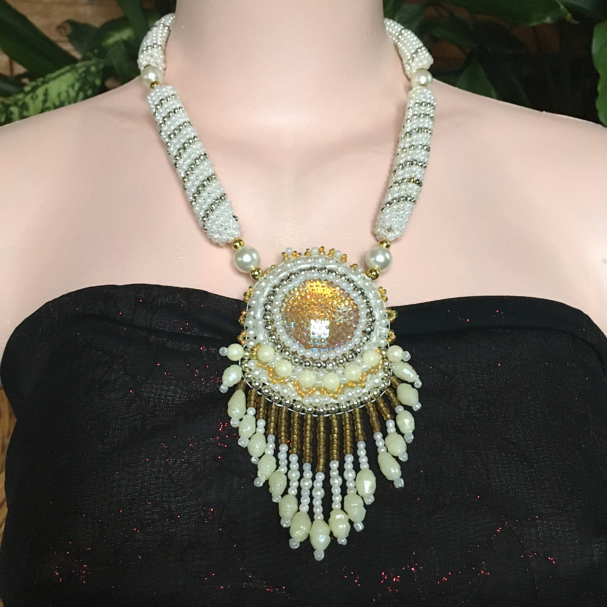 Когда я начинала свой путь к мастерству в украшениях, то после первой моей броши, я решила замахнуться на колье. Ведь при создании колье можно потрениповаться в нескольких техниках сразу : вышивка кабошона, жгут, оригинальная сборка. Я собрала по сусекам все, что нашла на тот момент дома. Камней, дорогого бисера и фурнитуры у меня не было. Но я ведь учусь техникам, поэтому итак сойдет, подумала я и приступила к работе. Пришлось попыхтеть изрядно, пораспускать неудачные фрагменты, но результат меня порадовал. Ведь я так старалась. И тут случилась в моей жизни вечеринка, на которой было много богатых людей города. Я решила блеснуть своим новым "шедевром" И пусть он из дешевых материалов! Зато такого ни у кого больше не будет. А остальное все как я люблю - ярко, блестяще и крупненько. На вечеринке я еще раз убедилась в том, что, мужчины любят все яркое и блестящее. Ко мне подошел один из самых богатых мужчин города и выразил восхищение моему украшению. Сказал, что у его жены скоро день