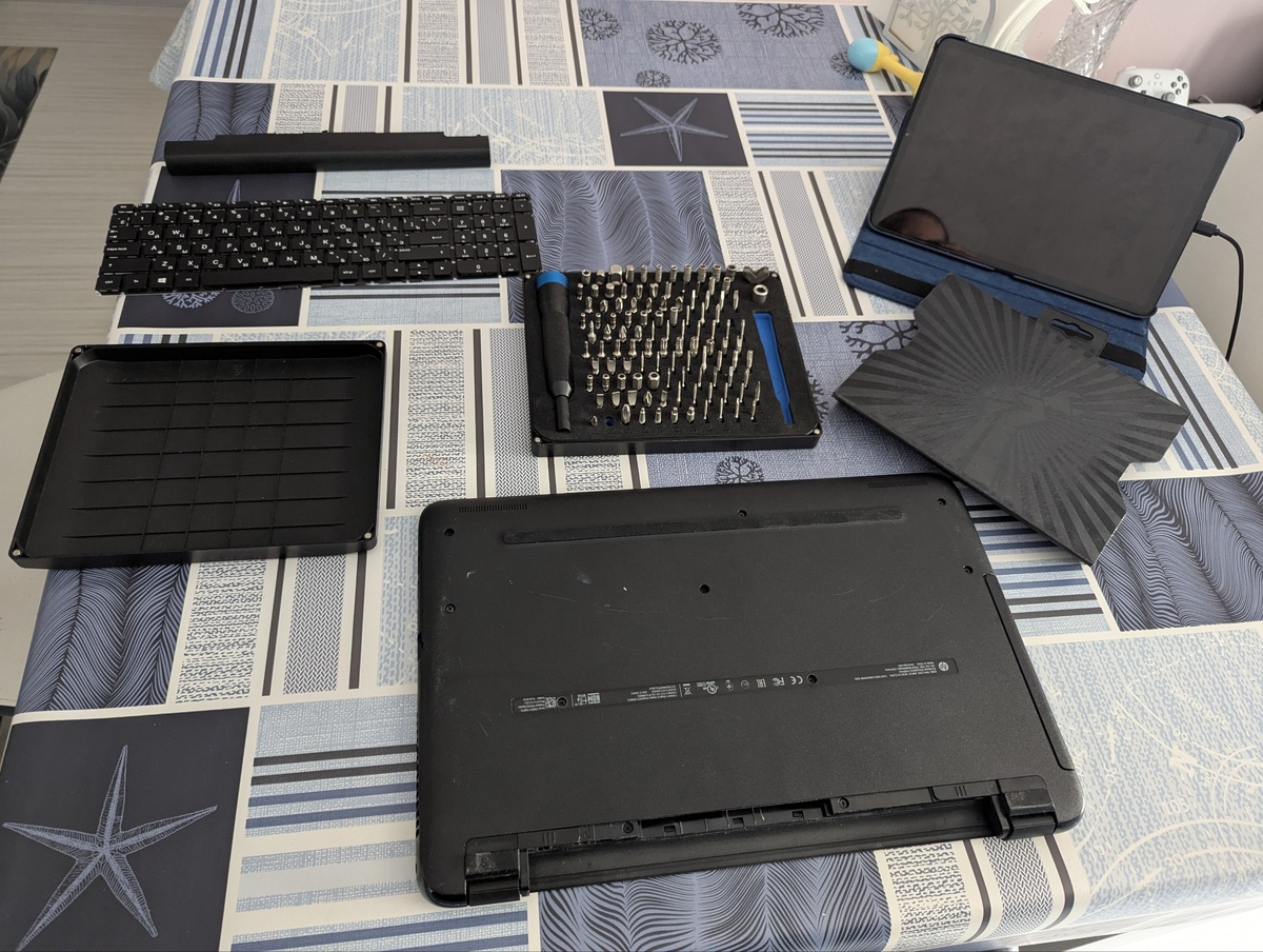 Само собой новая клавиатура потеряла плотность прилегания и в некоторых местах прыгает, что не очень хорошо. Возможно в следующий раз разберу и просто приклею всё на плотный 2-х сторонний скотч, который в случае чего можно будет отодрать. И на сим с ноутбуком всё. Минимальный дисплей у него есть, исправные клавиатура и батарея тоже - пользуйся не хочу. Нужен FullHD, подрубаешь его к внешнему монитору.