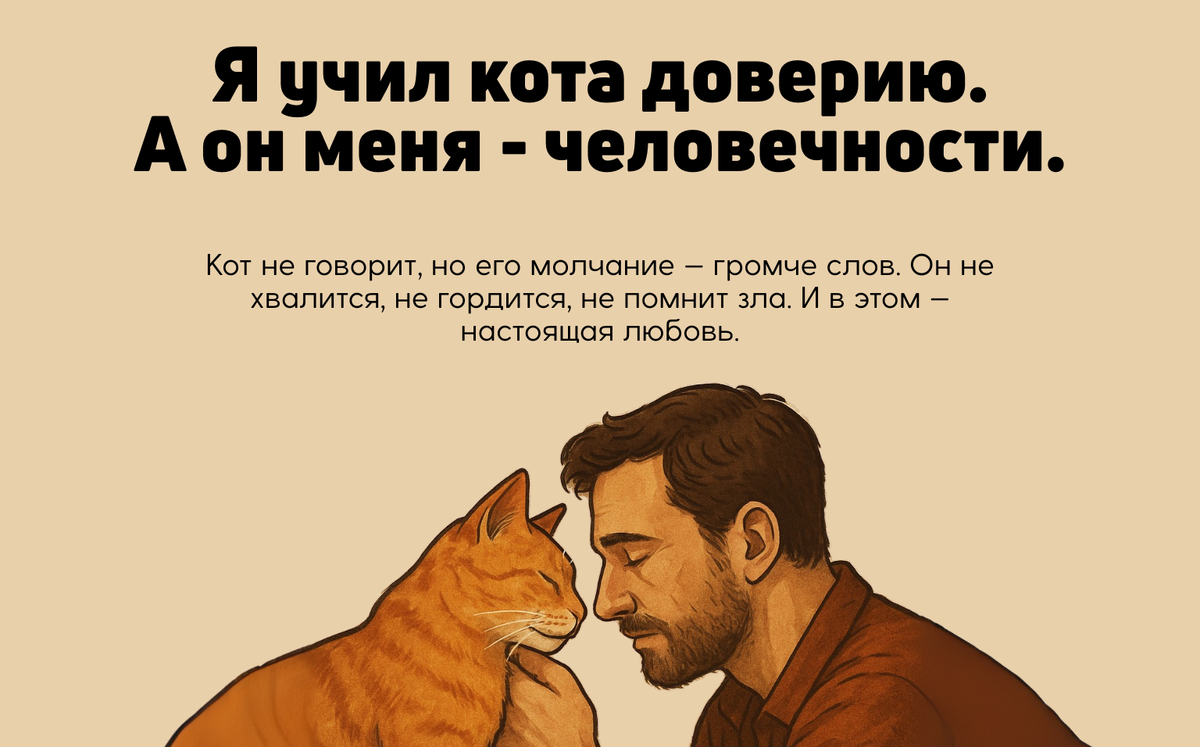 Я учил кота доверию. А он — меня человечности. Кто из нас в итоге стал мудрее? Кот не говорит, но его молчание — громче слов. Он не хвалится, не гордится, не помнит зла. И в этом — настоящая любовь. «Пусть даже я говорю на языках человеческих и ангельских, но если нет во мне любви — я лишь грохочущая медь...» Это из Библии. Послание Коринфинам... Но я понял эти слова не в церкви, не в книжке, не в драматический момент. Я понял их, когда бывший уличный кот Мохнатик положил голову мне на руку. Он не говорил. Не молился. Не пытался объяснить. Он просто был рядом. А я, человек с дипломом, с книгами, с речами, вдруг почувствовал себя учеником. Потому что коты живут по этим правилам каждый день. Они не хвалятся. Не завидуют. Не помнят зла. Они просто любят. И я стал лучше, когда научился у них. Когда я забрал Мохнатика, он был таким, будто его жизнь — это постоянный бой. Он шипел, царапал, убегал. Он не хотел быть домашним. Он не верил, что можно быть в безопасности. Но я не торопил его. Я п