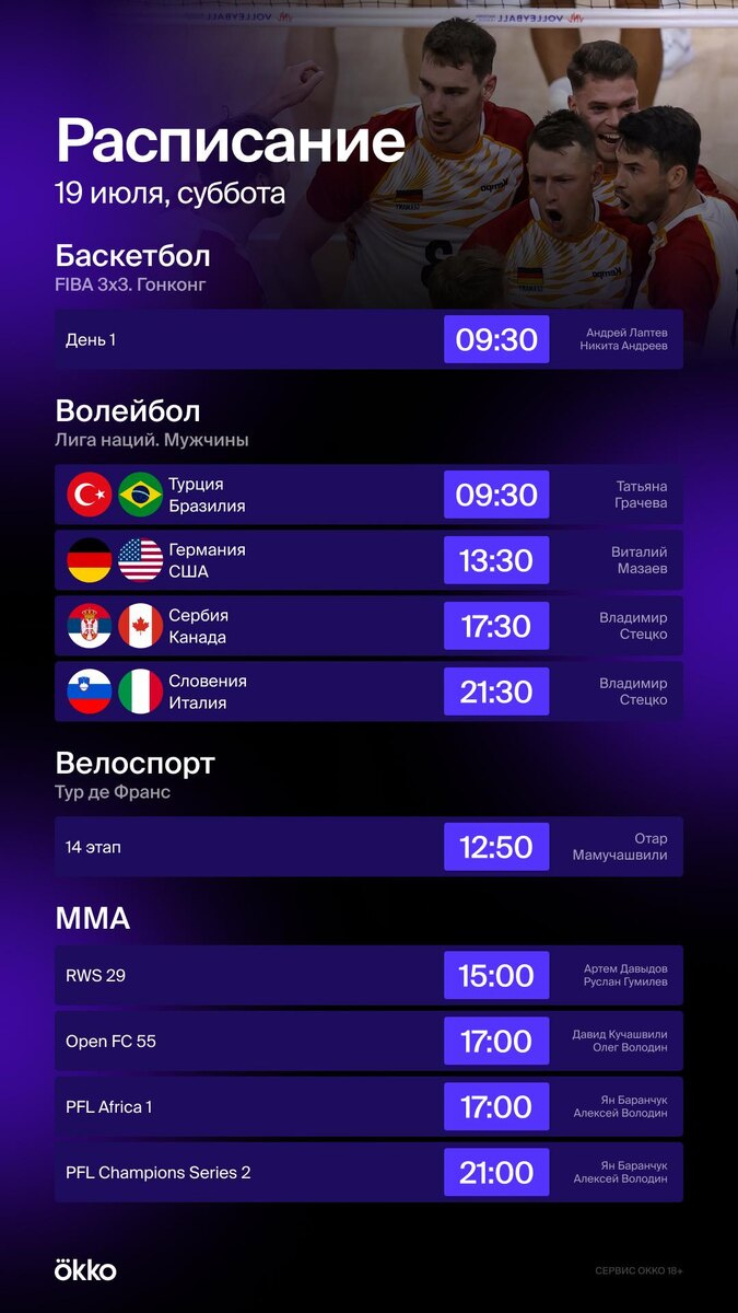 Обычная суббота в середине июля. Как тебе? 🤩 Товарняки, РПЛ, женские Кубок Африки и Кубок Америки, баскет 3х3, 14-й этап «Тур де Франс», волейбол, MMA и даже гонки на воде. Фух, вроде бы все перечислили 🥵 ⚡️ Только в Okko: https://okko.tv/s/4ot