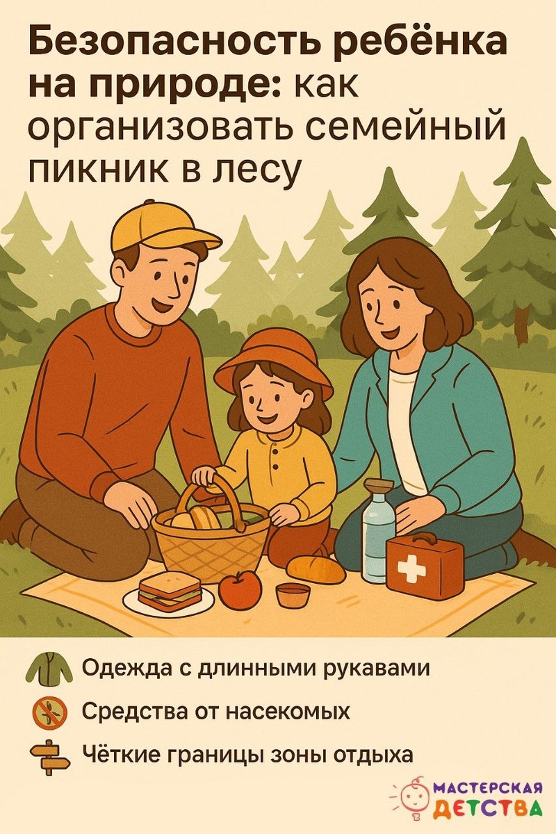 🌼 Пикник в лесу — радость для всей семьи. Но главное — безопасность. Если планируете выходные на природе, не забудьте простые меры, которые сделают отдых приятным и спокойным. 💡 Что важно учесть: 🧥 Одежда с длинными рукавами — защитит от клещей и комаров. Добавьте панамку и лёгкую ветровку. 🧪 Средства от насекомых — выбирайте подходящие по возрасту и обновляйте каждые 2–3 часа. 🗺 Чёткие правила: куда можно идти, а куда нет. Дети должны знать границы зоны отдыха. ✨ Мини-аптечка под рукой — пластыри, перекись, средство от укусов. 🧃 Питьё и лёгкая еда — заранее упакуйте всё, чтобы не возиться на месте. Не берите скоропортящееся. ❗️ И главное: не отпускайте ребёнка одного даже «на минутку». Лучше пусть играет рядом — в мяч, с палочками, собирает шишки. Пикник — это не только отдых, но и совместная традиция, которая даёт детям чувство защищённости и тепла. #МастерскаяДетства