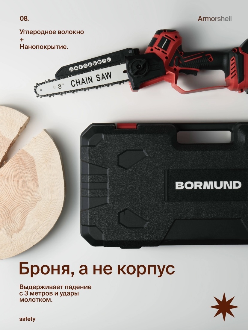 Bormund : Беспроводная мощь для серьезных задач Заказать на WB bormundsaw.mobz.click/PREDATOR Арт : 371144894 аккумуляторная цепная пила Bormund – инновационная мощь в ваших руках, без компромиссов Сверх мощный безщеточный двигатель 2500 Вт: Невероятная производительность! Сравнима с сетевыми и бензиновыми моделями. Валит деревья и пилит толстые бревна как масло. Абсолютная автономность : 2 аккумулятора по 6000 мАч! с системой fast charge Полный профи -комплект: 2 шины 6 и 8 дюймов – идеально для тонких веток и валки крупных деревьев! 3 цепи – всегда острая замена под рукой. Зарядное устройство – быстрое восстановление мощности. Защитные очки и перчатки – безопасность прежде всего! автоматическая смазка цепи : Система сама подает масло, продлевая жизнь цепи и шине, обеспечивая чистый и быстрый рез. Ваш инструмент всегда защищен надежность профессионала : Бесщеточный мотор не только мощнее, но и долговечнее, требует меньше обслуживания. Bormund – это инвест
