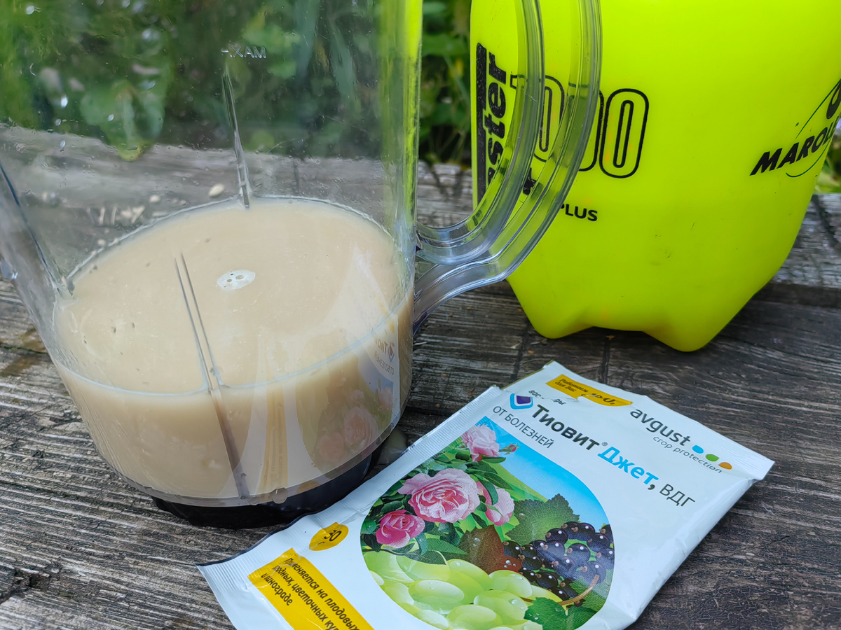 Хоть он и готов к применению, (просто добавь воды). Но сначала я развожу его в небольшом количестве и основательно разбалтываю. Дело в том, что часть порошка может слипнуться комочками, прилипнуть к дну опрыскивателя. А если развести в банке, всё это становится видно.