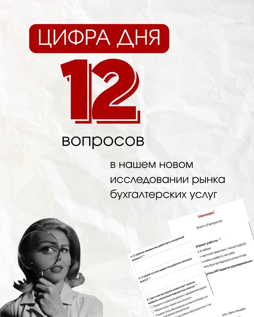 Мы замахнулись на новое исследование! 📈 Чуть больше года назад мы провели наше первое масштабное исследование — тогда мы анализировали, как на рынке бухгалтерских услуг обстоят дела с ценами. Благодаря вашему включению, а анкету тогда заполнили более 2000 бухгалтеров, нам удалось собрать достаточно данных, чтобы сделать объективные выводы, которыми мы поделились с вами на мастер-классе🎙️ ♦️И вот, мы готовы провести ещё одно исследование рынка бухгалтерских услуг и надеемся на ваше активное участие — в наших общих интересах! На этот раз будем изучать, предприниматели из каких ниш и направлений наиболее охотно работают со специалистами на аутсорсинге, а также, с какими клиентами предпочитают работать сами бухгалтеры. Кто готов платить достойные деньги за бухгалтерские услуги, и сколько клиентов в среднем может вести один бухгалтер без отказа от личной жизни и отдыха. Вопросов в анкете всего 12, ответы займут не более 10 минут. Результатами мы, конечно, с вами поделимся — осенью