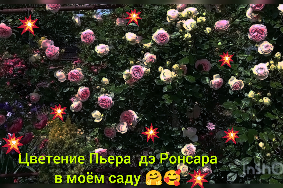 Моему Пьеру Четыре сезона, это мощная роза💪💪💪, поэтому часть побегов я подстригаю лесенкой, тем самым провоцируя цветение по всей поверхности до самого низа куста😍🌹🌹🌹.