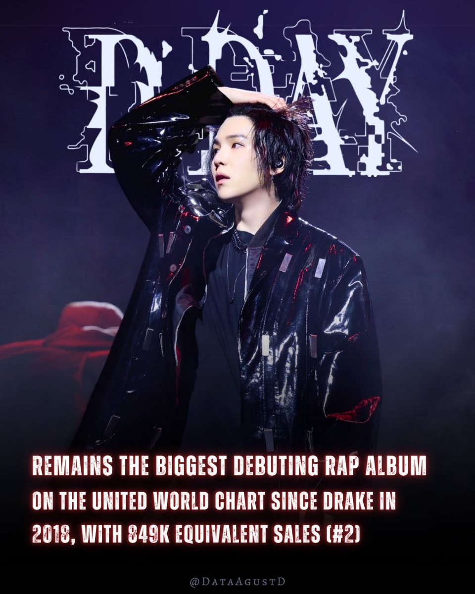 Альбом Юнги "D-DAY" остаётся самым масштабным дебютным рэп-альбомом в глобальном чарте United World с 2018 года, когда лидировал Drake — с 849 тысячами эквивалентных продаж! Несмотря на многочисленные рэп-релизы, рекорд до сих пор не побит! А также Юнги преодолел отметку в 5 миллиардов прослушиваний на Spotify по всем трекам, выпущенным под именами SUGA, AgustD и BTS SUGA (соло-композиции)! Юнги является первым корейским рэпером, который достиг этого рубежа.