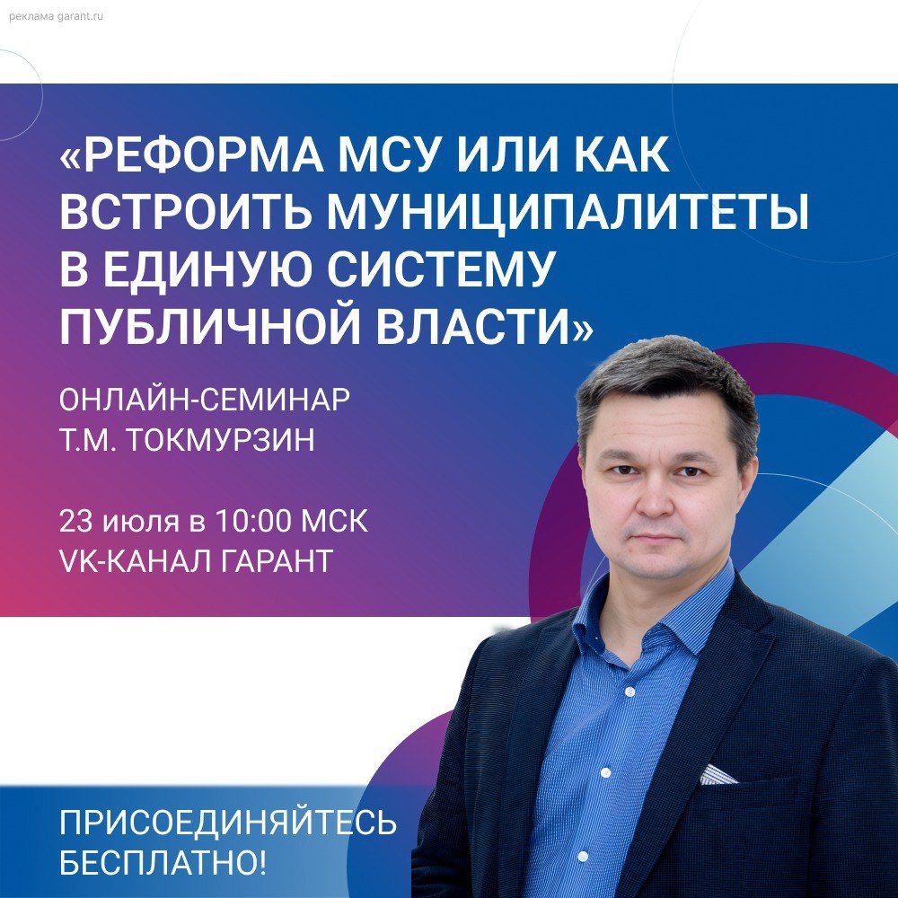 Приглашаем на онлайн-трансляцию семинара Токмурзина Тимура Маратовича, к.э.н., доцента кафедры государственного и муниципального управления Финансового университета при Правительстве РФ. 🏁 23 июля, начало 10:00 мск. 🤩 Участие бесплатное! Вас ждет: ⏺ интересный разбор заявленной темы; ⏺ ответы эксперта на ваши вопросы в прямом эфире; ⏺ раздаточный материал после мероприятия; ⏺ электронный сертификат об участии в семинаре. Предварительная регистрация обязательна! 👈