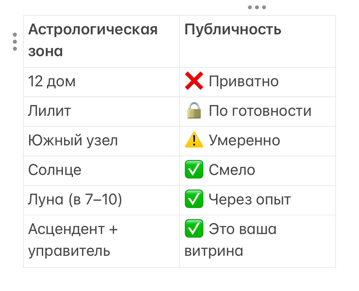 Личный свет и святая тень в натальной карте «Счастье любит тишину» — слышали? А теперь представьте: натальная карта — это как карта сокровищ, где чётко обозначено, что стоит хранить, как драгоценность, а что — смело нести в мир. Сегодня говорим о том, что в вашей карте стоит беречь в тени, а что освещать без страха. 🌘 Что скрывать: Тень, внутренняя сила и святая приватность 🪞 1. 12 дом — Дом тайн и душевной алхимии Планеты в этом доме — не для всех. Это глубокие подсознательные пласты, талант к исцелению, интуиции, уединению. 💡 Совет: Оставьте в тишине свои внутренние практики, страхи и глубины. Пусть это станет вашим источником силы, а не точкой уязвимости. Показывать — можно результат, но не сам процесс. 🖤 2. Лилит — Зона теневых травм и магнетизма Там, где Лилит, — мы чувствуем, что нас могут «раскусить». Это источник и боли, и магнетизма. 💡 Совет: Публично делиться этими темами стоит только после глубокого личного проживания. Не спешите открывать своё самое уязвимое мест
