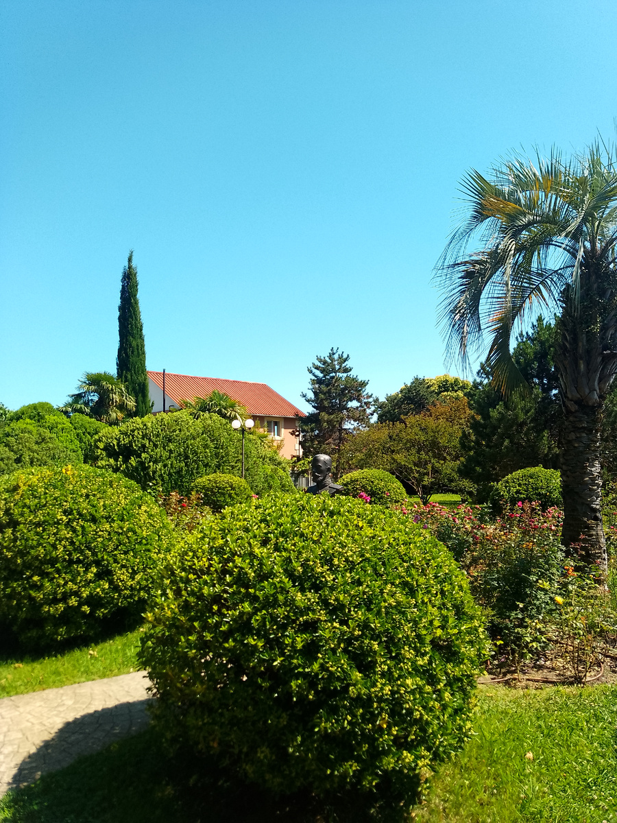Подниматься не так приятно! В парке есть небольшой розарий. Приятные аллеи для прогулок Пальмы перемежаются с платанами. И сосн