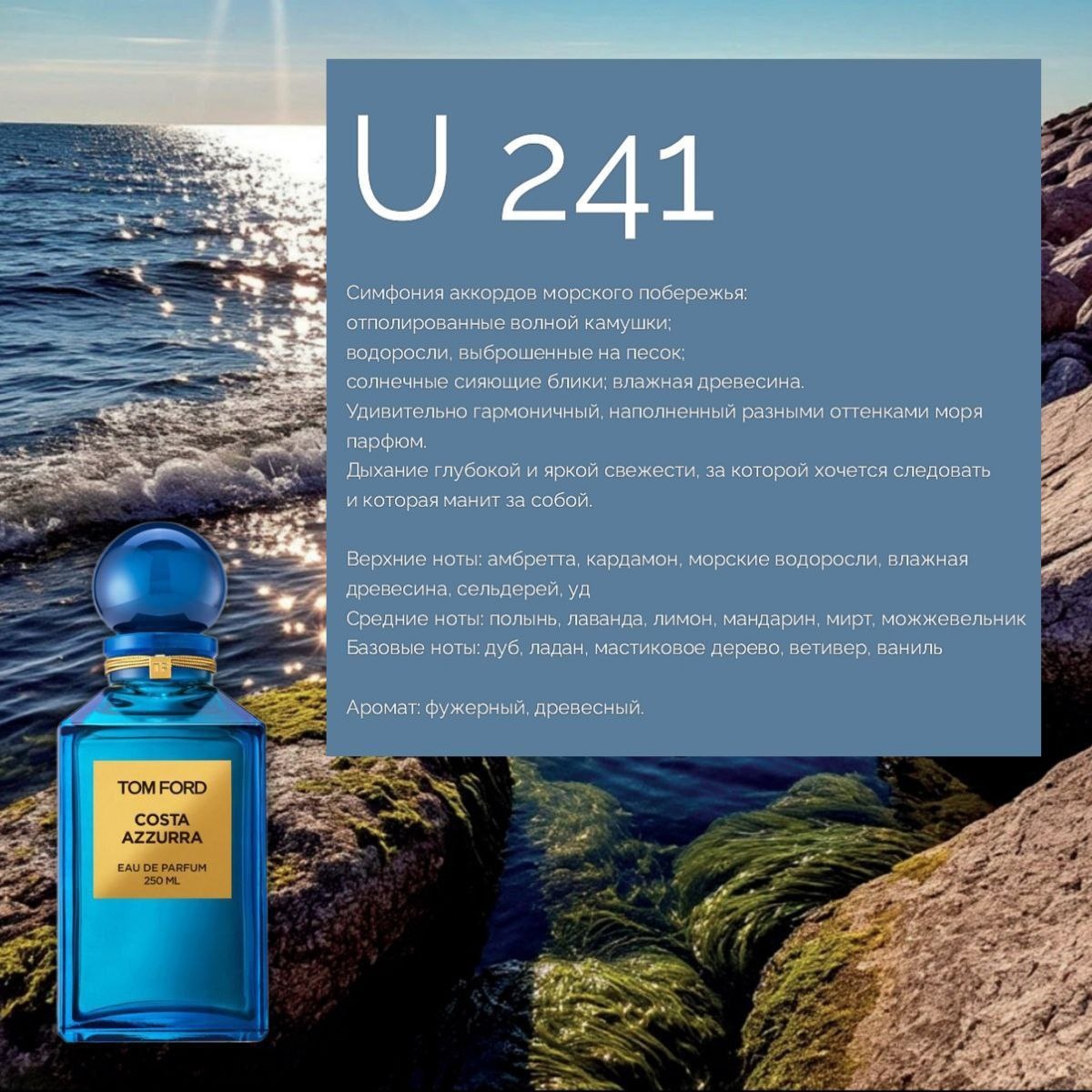 😊😊😊😊 Симфония аккордов морского побережья: отполированные волной камушки; водоросли, выброшенные на песок; солнечные сияющие блики; влажная древесина. Удивительно гармоничный, наполненный разными оттенками моря парфюм. Дыхание глубокой и яркой свежести, за которой хочется следовать и которая манит за собой. Верхние Ноты: амбретта, кардамон, морские водоросли, влажная древесина, сельдерей, уд Средние ноты: полынь, лаванда, лимон, мандарин, мирт, можжевельник Базовые ноты: дуб, ладан, мастиковое дерево, ветивер, ваниль Аромат: фужерный🌿, древесный🪵 Аккорды: 💘свежий пряный 🌷тёплый пряный 🌺морской 🔶фужерный 📎травяной 🌷цитрусовый 🔹амбровый 💓древесный Цена: 30 мл - 2400₽ 2 мл - 200₽ Для заказа @marina_kurman #костааззурра #томфорд #марсо #marso #купитьпарфюм #оригинальнаяпарфюмерия #распив #tomford #costaazzurra #u241 #241