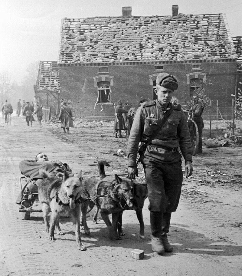 Собачья упряжка доставляет раненого советского солдата в госпиталь. 1-й Украинский фронт, 1944 год.