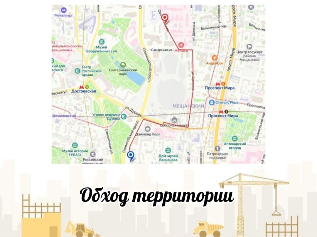 Планируем пройти от дома 7 в Орловском переулке через Самарскую улицу, далее по улицам Щепкина и Дурова, до 2-го Троицкого переулка, дом 8/10, строение 5.