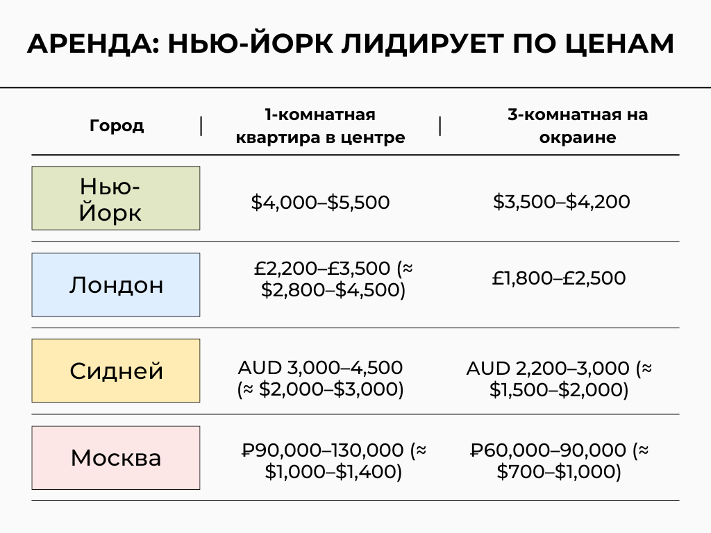 Нью-Йорк и Лондон — самые дорогие города для аренды.