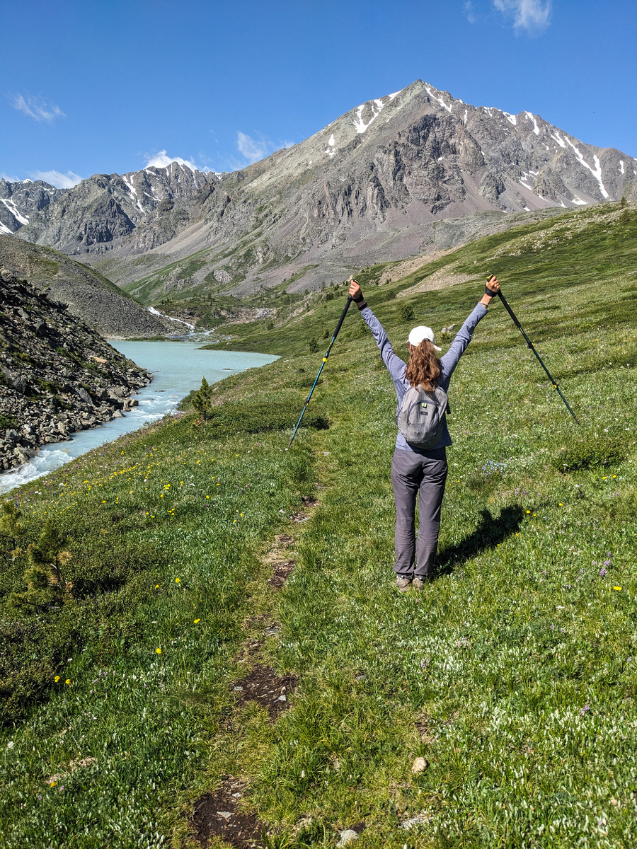 В 9 утра мы вышли к Каракабакским озерам. Светило солнышко. Нас ждал набор высоты 250м. До первого озера от места нашей стоянки идти было всего лишь 3,5 км. Меньше чем через час мы были у первого озера. Подъем несложный. Между первым и вторым озером небольшое расстояние. Озера окружены горами. Подобные места всегда выглядят очень красиво. Народа никого). Это уже привычно для нас на этом маршруте). Очень классно гулять без толп туристов). Мы дошли до края третьего озера и выше подниматься не стали. Кажется, к 10 дню мы уже порядком нагулялись, и на приключения нас тянуло все меньше. Хотя по карте выше тоже были небольшие озерца. Да и перевалов рядом хватало. Можно было бы ещё прогуляться и посмотреть на все это с высоты). В итоге размеренная прогулка заняла у нас около 4 часов. Вернувшись в лагерь, мы собрали вещи и совершили переход в пару километров. Мы приближались к цивилизации) Четкого плана на следующие дни у нас не было. Просто идти на выход не хотелось. Дойдя до домика ал
