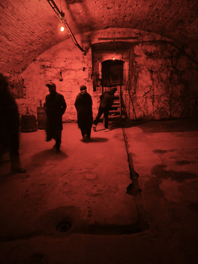 Вот так вода повлияла на кирпич В какой-то момент было решено укрепить свод бетоном. Но не удалось завершить задуманное... Тут и колодец есть. Сейчас туда кидают монетки, загадывают жедания. И они, конечно, сбываются. Чесслово! Интересное пространство Вот зачем эта арка?... Вещи тут, я подозреваю, больше для антража... Оригинальные "запчасти" Тут и старые трубы сохранились Большой зал. И похоже это и самый старинный зал. Даже есть версия, что пивное производство основали из-за того, что тут был этот подземный зал. Ну, и своды тут необычные Как камень продавился... Всё равно люблю рассматривать старые вещи