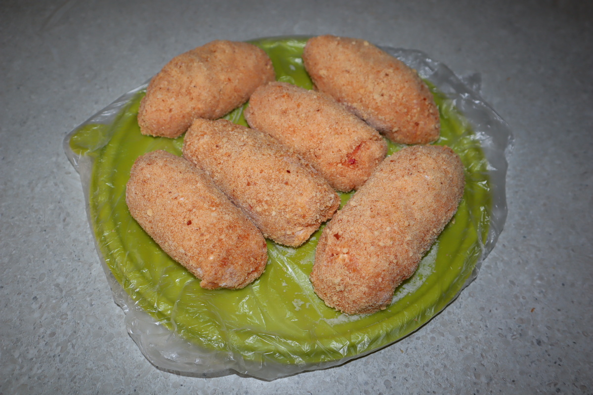 Берем большой плоский противень или разделочную доску, которая поместится в морозильную камеру и застилаем пищевой пленкой. Раскладываем запанированные кусочки индейки на противне. Отправляем в морозильную камеру на 3-4 часа. Цель – чтобы каждый кусочек хорошо замерз и стал твердым. Затем перекладываем в пакет и убираем обратно в морозилку.