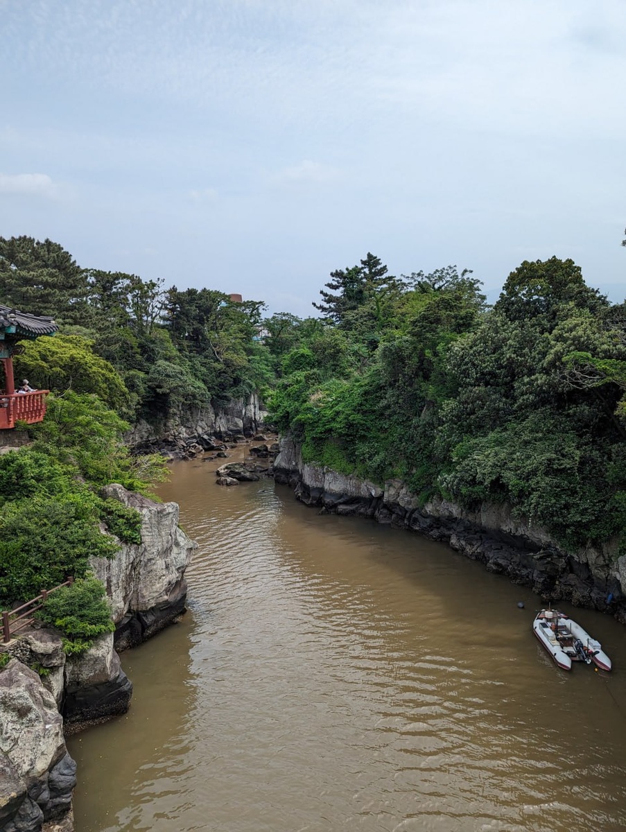 Достопримечательность, которую мы не заметили Перед вылетом с Чеджу мы пожили три дня на севере острова, поближе к аэропорту. В первый день пошли осматриваться. Идя в рандомном направлении от отеля, минут через 10 оказались в парке, разбитом вдоль реки, которая текла где-то внизу, а напротив парка возвышалась скала. Скала, лес, река — всё это в городе. Ничего необычного, просто Корея. Ах да, на входе в парк чьи-то огороды. Не поля, а маленький такой клочок земли, который кто-то засадил капустой. Сказочный городок. Дальше вышли на набережную, там дорожка, всё как обычно. И тут замечаю недалеко от нас какие-то люди в гидрокостюмах бросают на камни в сторону воды какие-то буйки с сетками и сами лезут за ними. А другие люди стоят на набережной и фотографируют это действо. «Как странно», — подумала я. И сфотографировала это всё. Позже мы видели таких же людей в воде, они плавали по поверхности, а потом вдруг ныряли и нет-нет, нет-нет никого. Какие-то поисковые работы силами местных жите