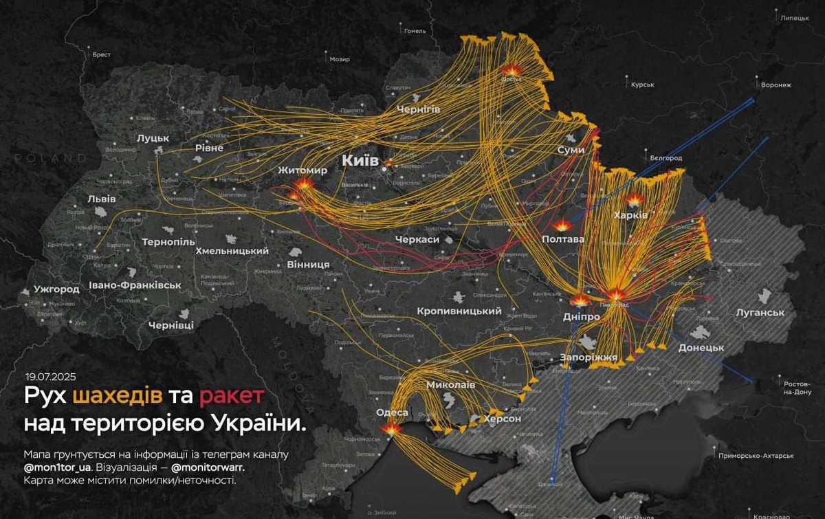 Схема ночного удара по Украине, в котором, по данным ВСУ, были задейсивованы 344 БЛА и 35 ракет различных типов
