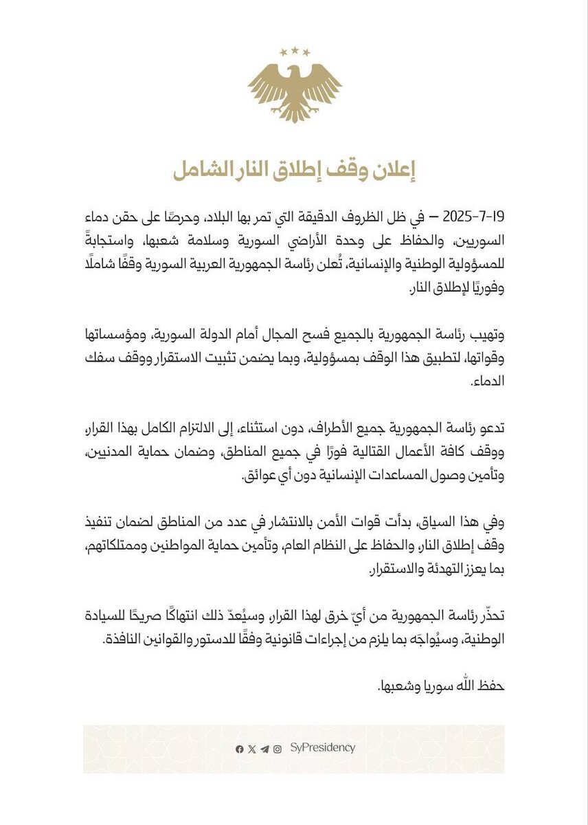 Syria announces 'immediate & comprehensive' nationwide ceasefire 'Warns against any violation'