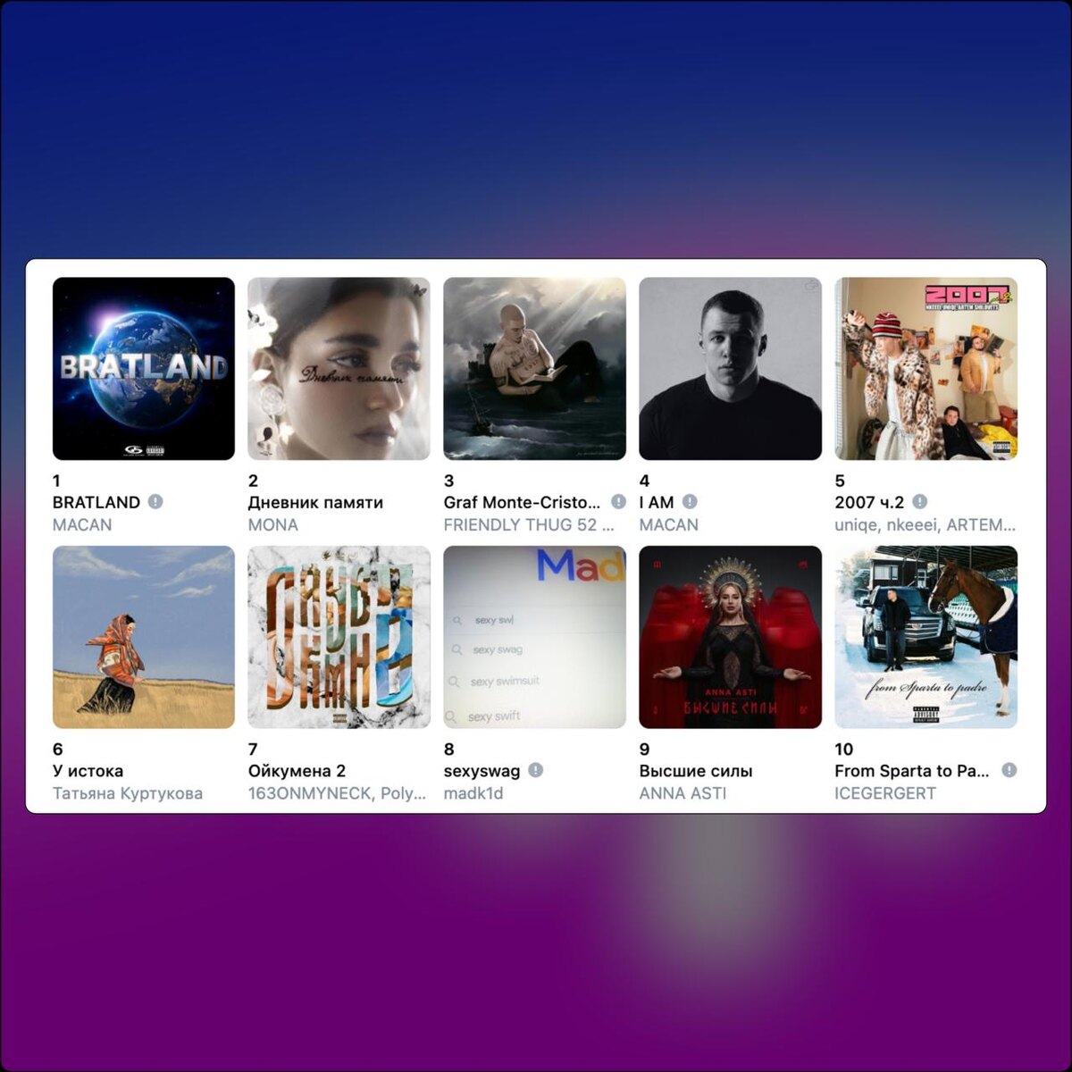 👑 🎵 MACAN начал покорять чарты в VK Музыка Вслед за чартом в Яндекс.Музыке, альбом «BRATLAND» уже находится на 1 месте в чарте альбомов VK Музыка («I AM» — на 4 месте). Таким образом, два альбома MACAN находятся в ТОП-5 чарта альбомов VK Музыка. В чарте песен 8 композиций с альбома «BRATLAND» — в ТОП-10. А в ТОП-5 — только песни MACAN'a. Альбом уже преодолел отметку в 2.5 млн. прослушиваний на официальном плейлисте в VK чуть больше чем за сутки. ❤️ — забрал пятницу очевидно 😈 — будет артистом года четвёртый год подряд @mainstreamusic
