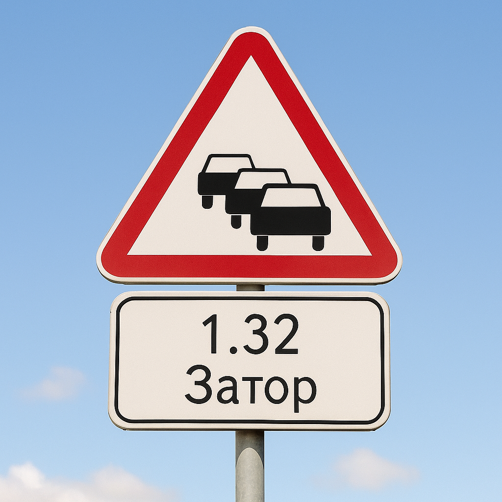 Знак 1.32 «Затор» — относительно молодой участник российской системы дорожных знаков. Его ввели в Правила дорожного движения России в 2006 году. До этого в нашей стране вообще не существовало отдельного предупреждающего знака о возможной пробке впереди — водителям приходилось ориентироваться по обстановке, радио или интуиции.